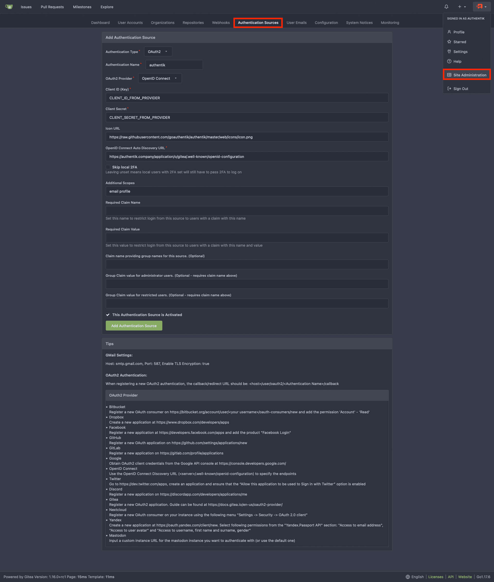 authentik.companyis the FQDN of the authentik installation.gitea.companyis the FQDN of the Gitea installation.